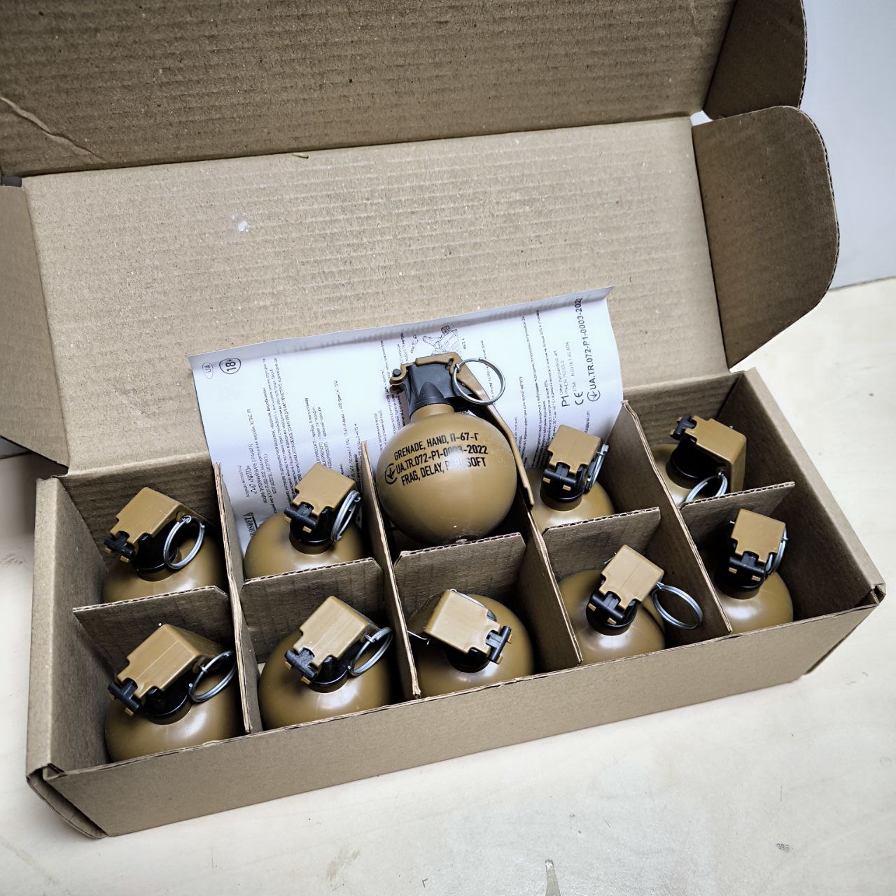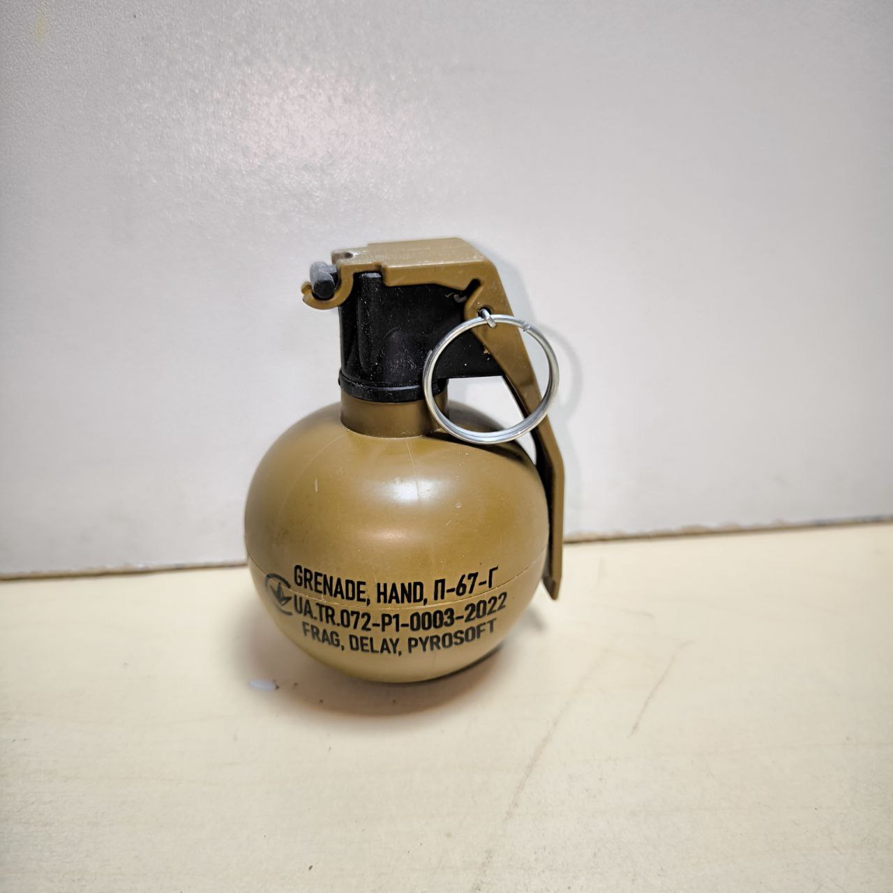 Граната П-67-Г “НАТО” навчальна, учебна з піротехнічним ефектом категорії Р1. Розмірами та принципом дії імітує бойову гранату M67 яка є на озброєнні США та блоку НАТО. З наповнювачем горох та парафин. Горох – імітує ураження осколками, парафін – фіксує горох у середині та усуває ефект “колотухи”. Використовується у військових тренувальних заходах, страйкбол, пейнтбол та військових реконструкціях на спеціально відведених полігонах та майданчиках поза межами громадських місць. Для безпечного отримання первинних навичок поводження та принципу дії гранати М67.