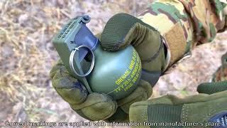 Граната обладнана активною чекою, що запобігає випадковому спалаху. Запобіжні заходи: обов'язково використовуйте засоби захисту очей, голови та кистей рук під час тренувань. Гранати зберігаються до 2 років у приміщеннях при температурі 0–40°C та вологості не вище 80%, на відстані щонайменше 0,5 м від опалювальних приладів. Перевезення дозволене будь-яким видом транспорту в оригінальній упаковці виробника.
