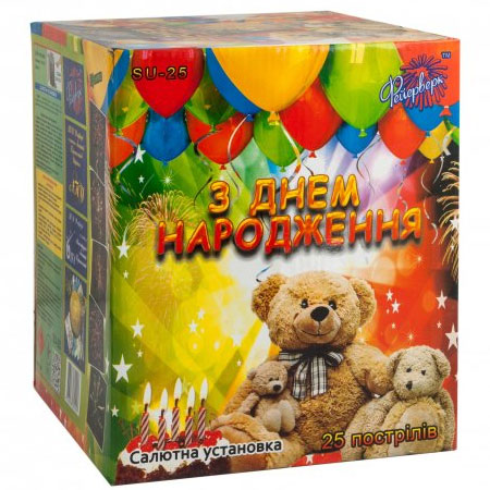 Салютная установка SU-25 С Днем рождения от ТМ Феєрверк заряжена на 25 выстрелов, калибром 25.