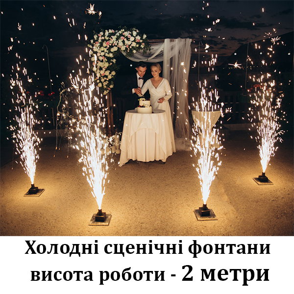 Фонтан з холодними іскрами для приміщення, іскри фонтана досягають до 2 метрів. Такі фонтани запускаються з спеціального обладнення піротехніком. Добре підходять для весілля на перший танок, на виніс торту, фонтани запускають на великих сценах на кульмаційні моменти, та інщі заходи . Сценічні фонтани запускаються по команді замовника секунда в секунду, фонтани максимально беспечні, можуть запускатись, як в приміщенні так і на вулиці. Беспечна відстань від фонтану від одного метра.