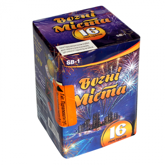 Салютная установка SB-1 Вогні міста от ТМ Феєрверк выдает 16 выстрела, калибром 20 мм (25-30м).